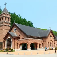 성당 종탑이 보이는 아랫마당에는 루루드의 성모상을 모셔놓은 성모동산이 아름답게 꾸며져있다.