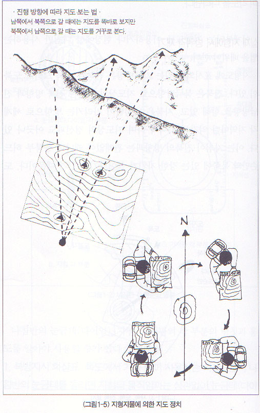 나침반이 없을 때, 나침반을 사용할 수 없을 때, 도로, 철도, 제방, 송전선 등 일련의 확실한 지형 지물을 찾아 지도상의 지형 지물과 일치시킴으로써 정치< 그림1-5 >된다.