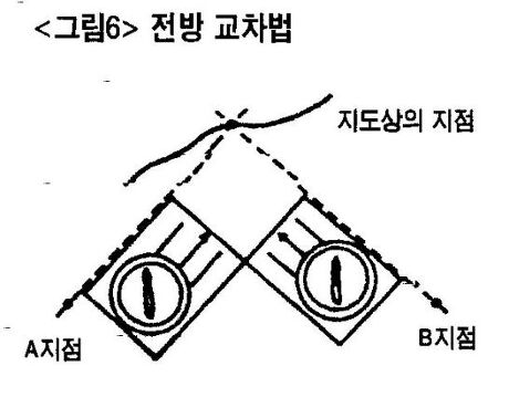전방교차법<그림6>은 지도상의 자기 위치는 알고 있으나 알고자 하는 지점의 위치를 지도상에서 찾을 수 없을 때 이용하는 방법이다.